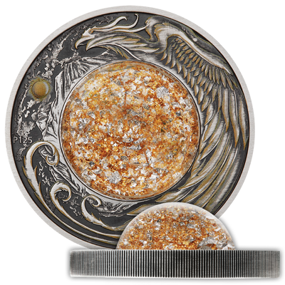 Srebrna moneta „Alicanto ” – wybita przez The Perth Mint z 2 uncji srebra najwyższej próby .9999. Limitowana do tylko 2 500 egzemplarzy na cały świat. Legenda o Alicanto pochodzi z chilijskiego folkloru, szczególnie z obszaru pustyni Atakama – jednej z najsuchszych i najbardziej tajemniczych krain świata. To piękna i symboliczna opowieść o świetlistym ptaku, który prowadzi ludzi do bogactwa… albo do zguby. Centralnym elementem rewersu jest kopuła zawierająca autentyczne cząstki złota i srebra zawieszone w płynie. Tworząc w ten spsób specjalny,błyszczący efekt, który widoczny jest przy każdej zmianie kąta padania światła. Awers zdobi oficjalny portret króla Karola III. To połączenie wyrafinowanej grafiki, najwyższej jakości kruszcu i unikalnego efektu wizualnego czyni ją bardzo atrakcyjną zarówno dla kolekcjonerów, jak i inwestorów.