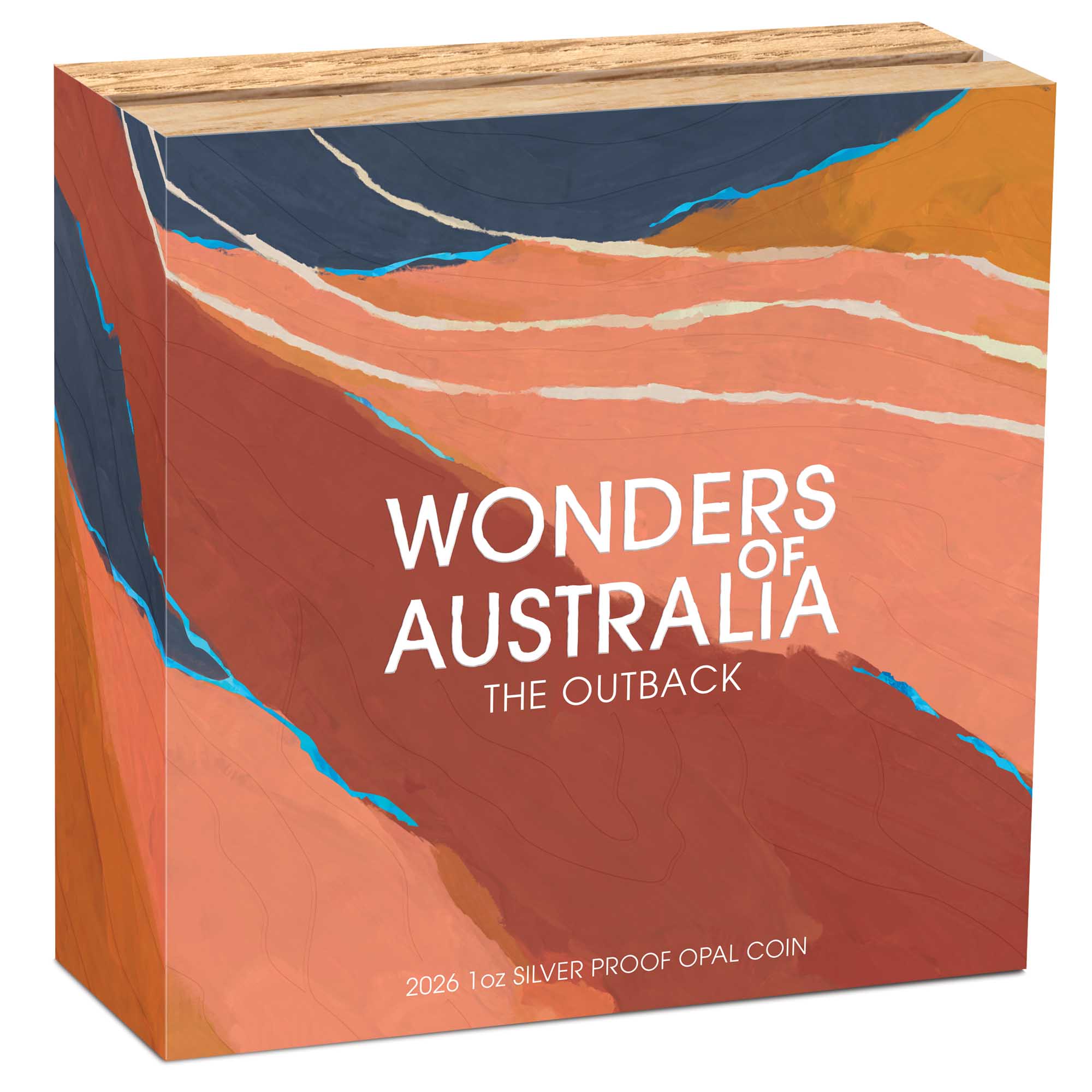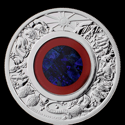 Rozległy, surowy australijski Outback ożywa na srebrnej monecie, w której centrum pulsuje autentyczna wkładka opalowa – narodowy kamień szlachetny Australii, zwany „ogniem pustyni”.