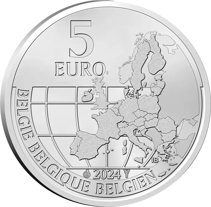 Awers przedstawia mapę Unii Europejskiej, otoczoną nazwą Belgii w trzech językach z nominałem 5 euro u góry i rokiem 2024 u dołu.