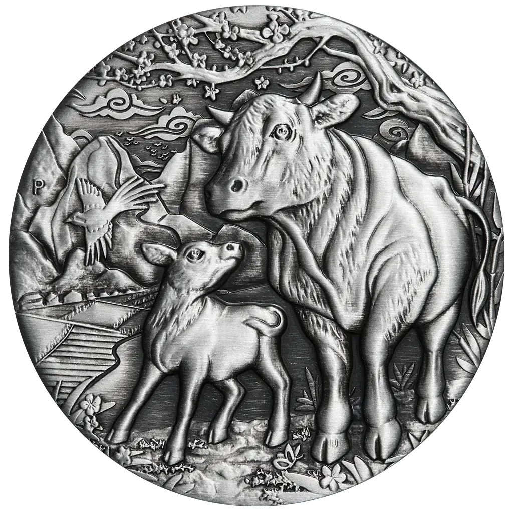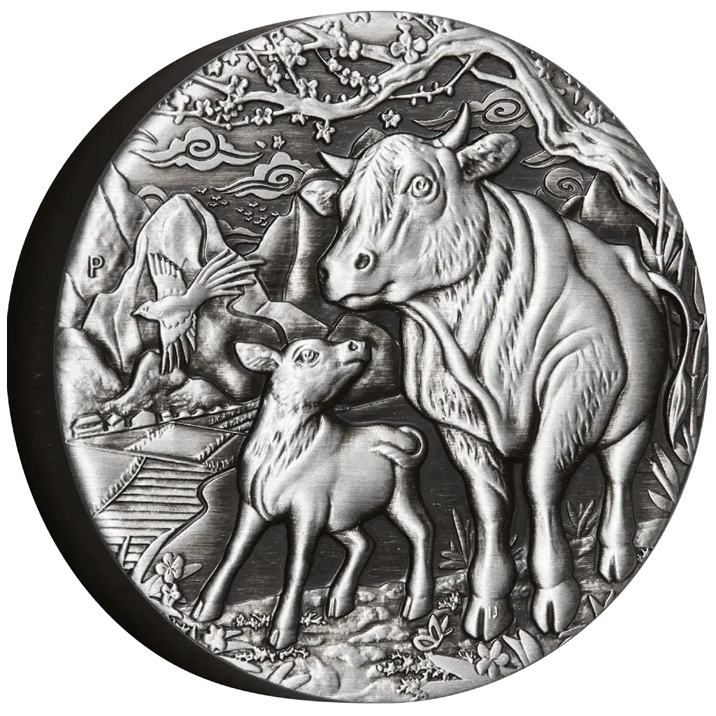 Rewers przedstawia wizerunek dorosłego wołu z cielęciem na tle sielskiej chińskiej scenerii z górską wioską, wiśnią i bażantem w locie. Obok tej sceny znajduje się menniczy znak „P” Perth Mint. Całość wykonana w jakości antiqued finish (postarzane wykończenie), które podkreśla detale i nadaje monecie głębię i charakter antycznego artefaktu.
