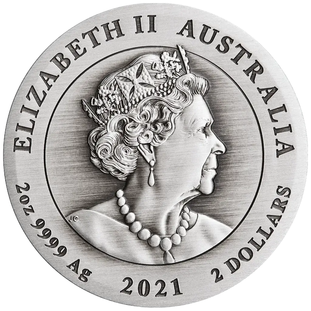 Na awersie znajduje się wizerunek Królowej Elżbiety II w klasycznym profilu, autorem wizerunku jest Jody Clark. Wokół portretu umieszczono informacje techniczne: rok emisji 2021, nominał 2 AUD, wagę 2 uncje oraz próbę srebra 9999 Ag. To standardowy motyw na awersach monet Perth Mint z serii Lunar III i potwierdza jej status legalnego środka płatniczego.
