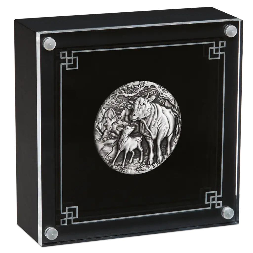 Srebrna, dwuuncjowa moneta kolekcjonerska z prestiżowej serii Australian Lunar Series III, wyemitowana przez renomowaną mennicę The Perth Mint. Edycja poświęcona Rokowi Wołu (Year of the Ox) według chińskiego kalendarza księżycowego. Osoby urodzone pod znakiem chińskiego Wołu są uważane za przyjazne, inteligentne, uczciwe i godne zaufania. Charakteryzują się wysoką etyką pracy, logicznym myśleniem i opanowaniem. Symbolizuje też pracowitość, wytrwałość i niezawodność. Wykonana jest z czystego srebra Ag 999,9 i ma postarzane wykończenie (antiqued), które nadaje jej efekt zabytkowego artefaktu.