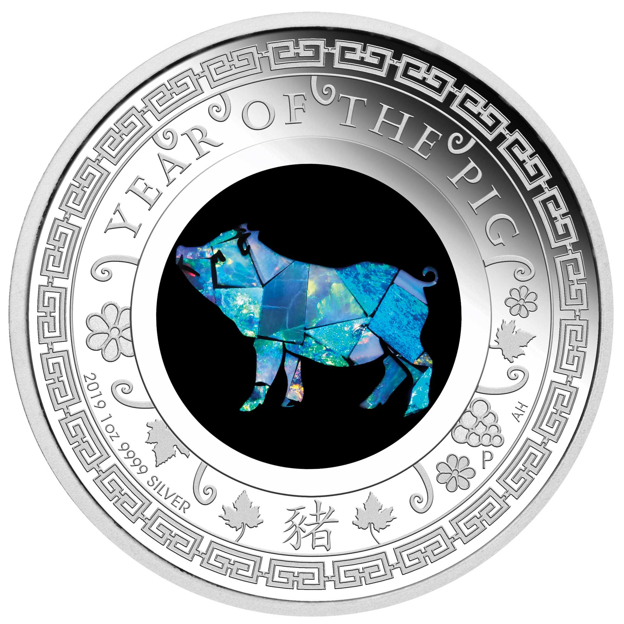 Rewers monety przedstawia kompozycję nawiązującą do chińskiego roku Świni 2019. Centralnym elementem jest Świnia wykonana z oryginalnego autralijskiego opalu, którego gra barw nadaje każdej monecie unikalny charakter – nie ma dwóch identycznych egzemplarzy.